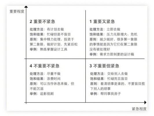 简单来说,就是按照重要程度和紧急程度,将自己近期的事情梳理一番,并按照1-2-3-4的顺序依次处
