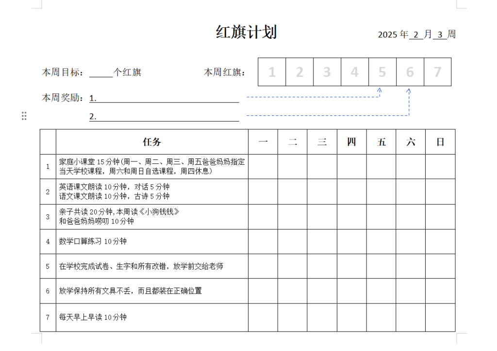 以上①-⑩所有问题都是在红旗计划的框架下完成的,红旗计划说起来也很简单,就是一个表格,里面有7项任务,对应周一到周天,这样下来一共49个格子,每天考察7项任务是否完成,完成的话用图章盖赞,没完成用图章盖加油,然后结算一周一共多少个赞,7个赞等于一个红旗,可以达成愿望。