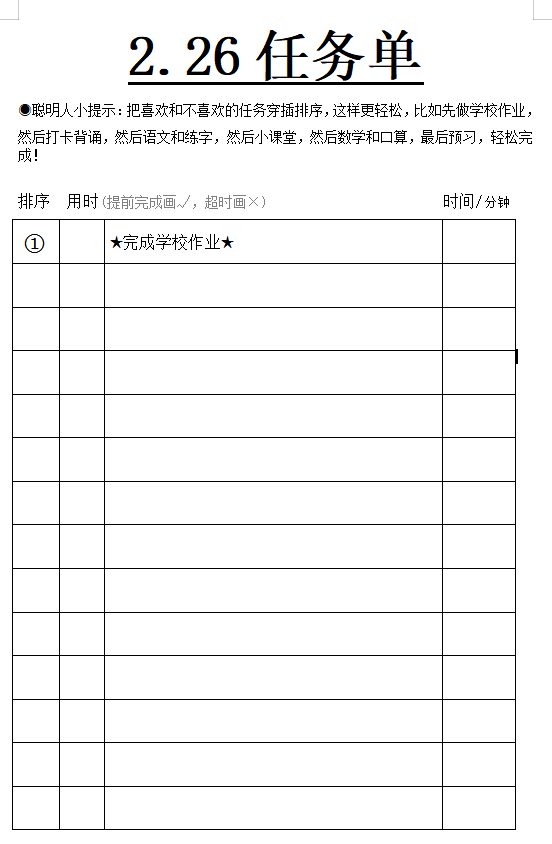 逻辑思维差其实按说这个年纪真的很正常,目前这个和做事慢的问题还没有解决,其他问题也还没有解决,正在积极想办法,不过关于逻辑思维的问题正在测试一个方法,就是任务单,每天把他要完成的任务(其实就是作业,包括写的、读的、背的、打卡的),都用表格打印出来,然后让他自己排序,有点作用,但作用有限。